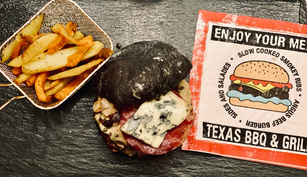 Un pain noir Ă lâencre de sĂšche, une viande 100% pur bĆuf, des oignons et de la pancetta grillĂ©s, une sauce poivre et une tranche de fourme dâAmbert.