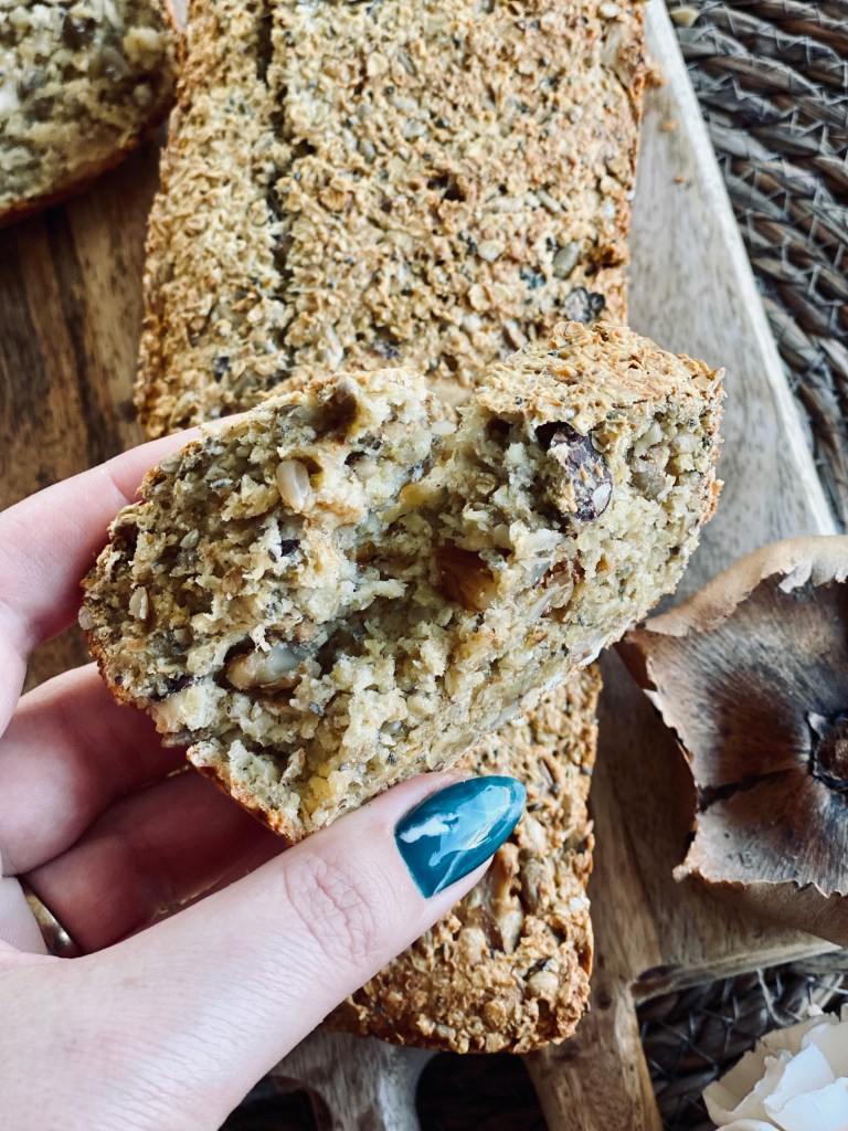 Préchauffer le four à 180*C. Battre les œufs et ajouter les flocons d’avoine. Mélanger. Ajouter ensuite le yaourt, le bicarbonate, le lait végétal, le mélange de graines et le mélange noix/ noisettes (broyé grossièrement au rouleau à pâtisserie)
