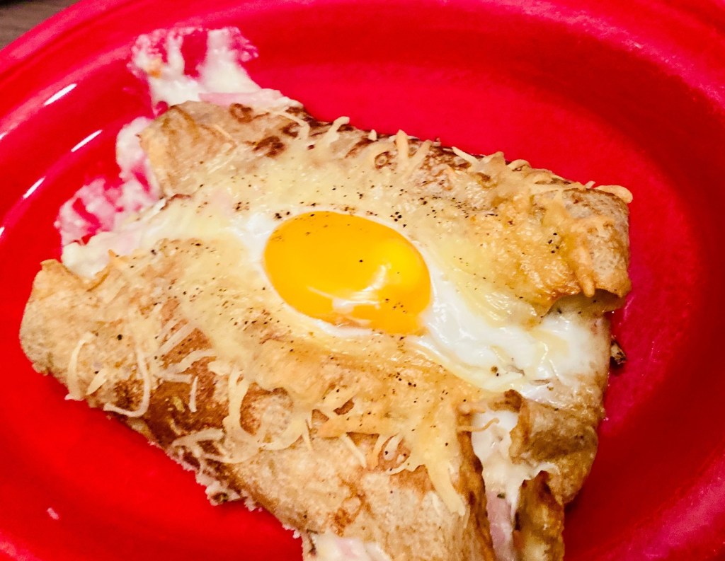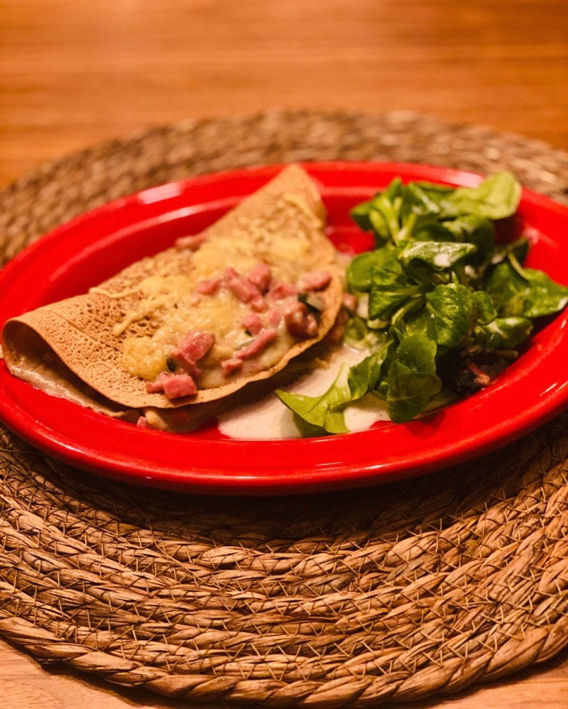Faire une béchamel pas trop liquide, ajouter des dés de jambon et du fromage râpé. Déposer la préparation au centre et plier la crêpe. Déposer dans un plat qui va au four, faites une place au centre et casser un oeuf parsemer du râpé.
