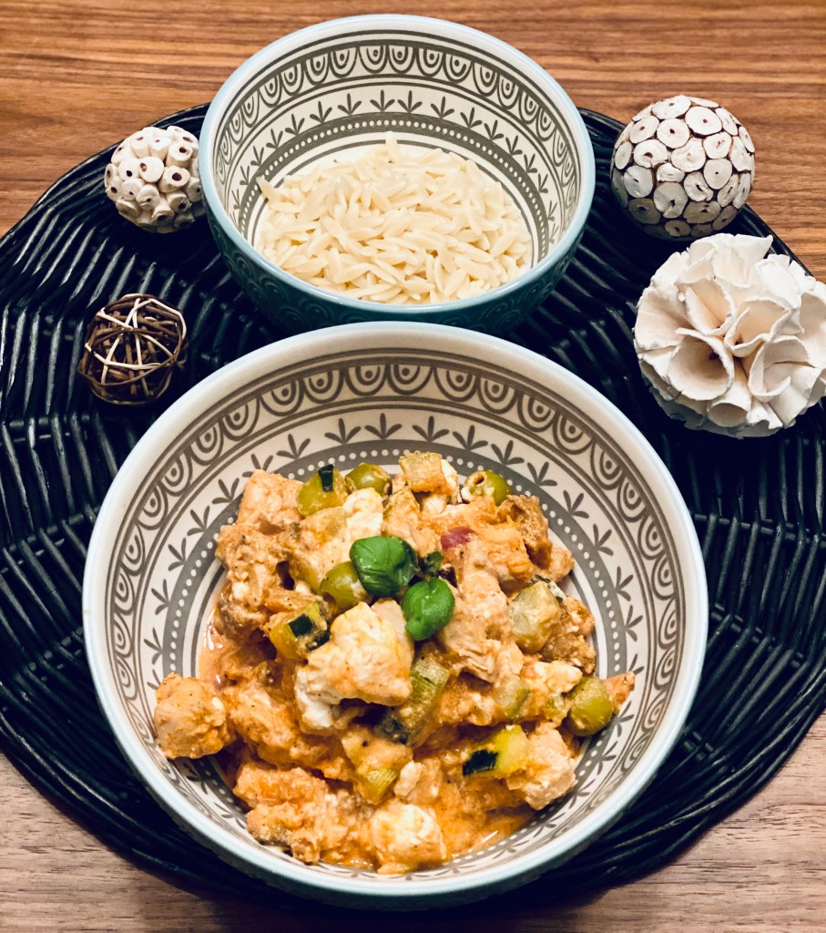 J’ai choisi d’accompagner ce plat avec des pâtes grecques.
