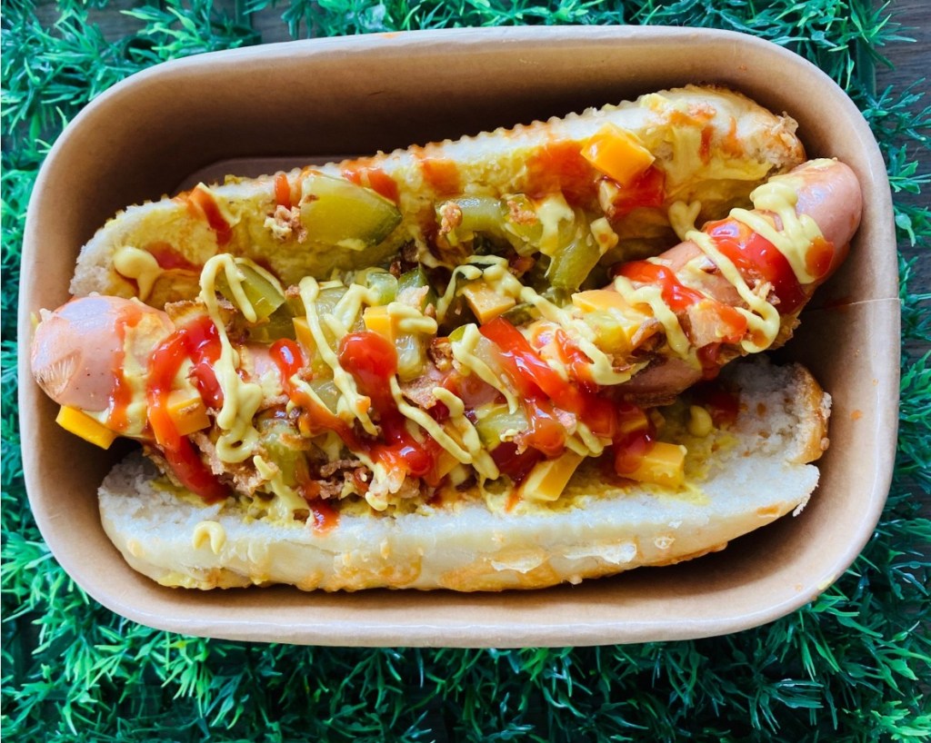Pain maison, saucisse de Francfort, moutarde, ketchup, cheddar, oignons croustillants. Allergènes : Farine de blé, œufs, lait, moutarde.