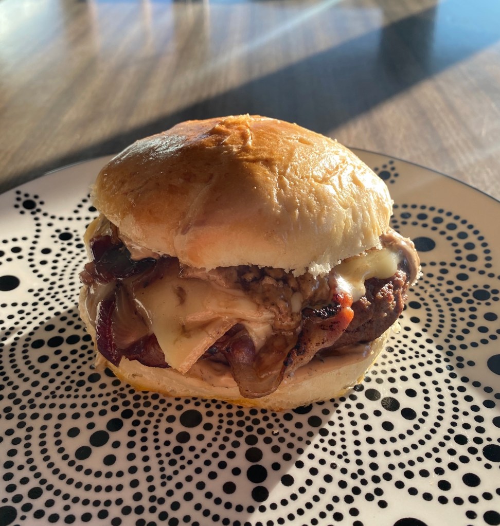 Le pain est fait maison et la viande 100% boeuf provient de la boucherie à Ruette : Quand la bouche rit. Elle est grillée et assaisonnée sel, poivre.
