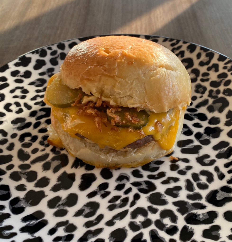 Cheddar : steak 100% boeuf, 2 tranches de cheddar , cornichons, oignons croustillants et sauce burger.