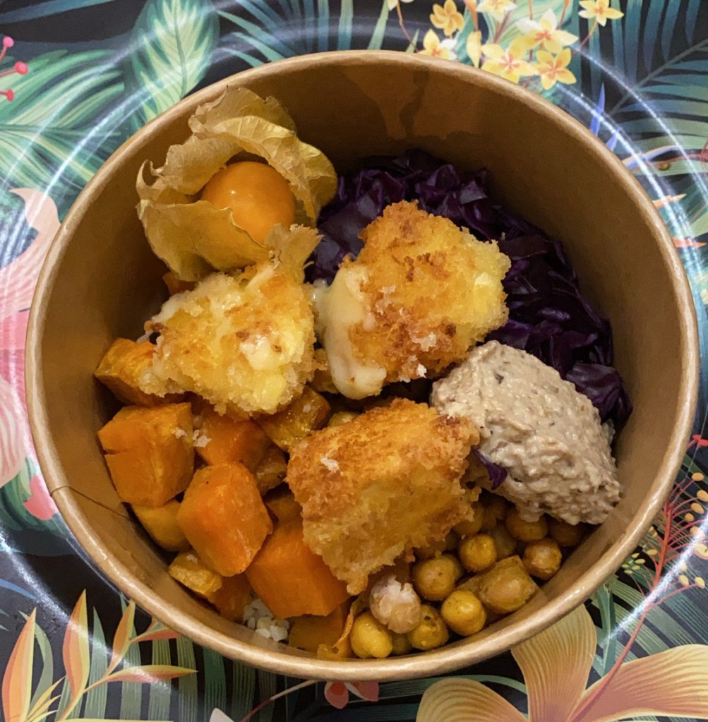 Boulgour, chou rouge râpé, patates douces au four, pois chiches au curry grillés, camembert pané à la chapelure panko, purée d’aubergines et physalis . Celui-ci peut se réchauffer légèrement au micro-ondes.