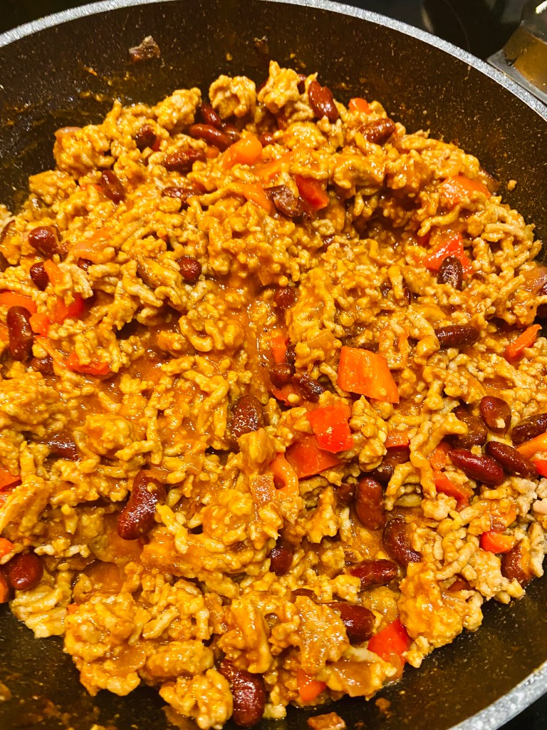 Faire revenir l’oignon et l’ail pressé dans de l’huile d’olive. Ajouter la viande hachée, quand la viande est colorée, ajouter le poivron en maïs morceaux, la boîte de haricots rouges, le coulis et les épices. Laisser mijoter. Rectifier l’assaisonnement.