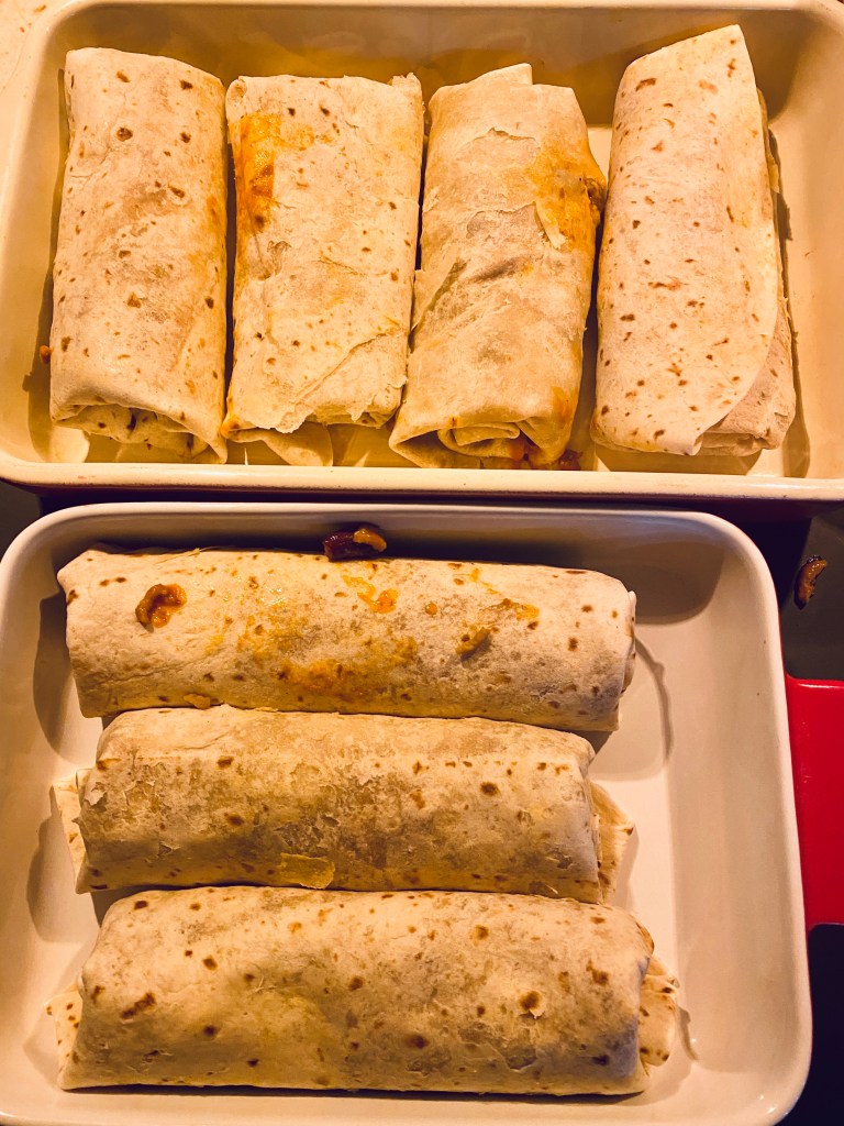 Quand ça a bien mijoté, préchauffer le four à 180C*, verser la préparation dans les tortillas. Plier les bords dans la dimension de votre plat et rouler. Disposer dans le plat.