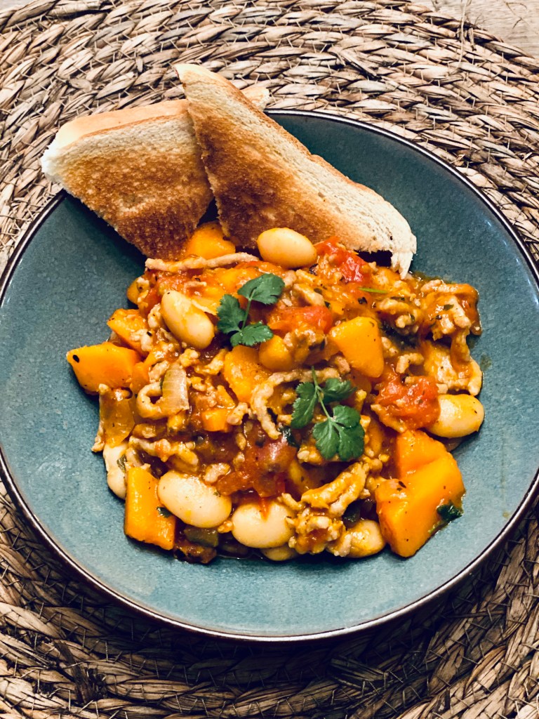 En attendant, dans un faitout, faire revenir l’oignon, la viande hachée de volaille et le poivron doux. Quand c’est coloré, ajouter la boîte de tomates aux légumes, le mélange potimarron et les haricots blancs. Ajouter de l’ail pressé, sel, poivre, de la coriandre fraîche et une pointe de pili-pili. Laisser mijoter. Goûter et rectifier l’assaisonnement.