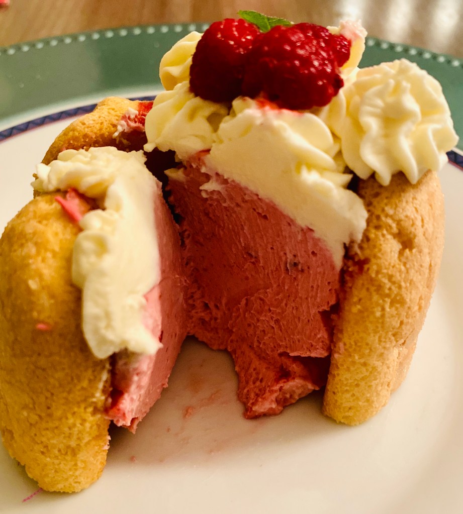 Imbiber des morceaux de boudoirs avec le sirop, et placer autour d’un emporte-pièce. Ajouter de la mousse de framboises et placer au frais.