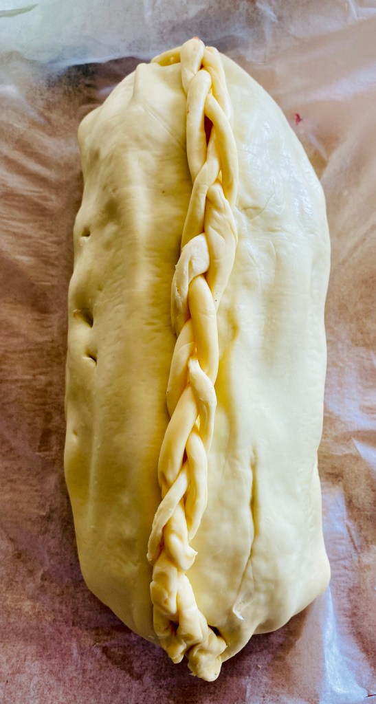 Ensuite, on lâemballe dans les pĂątes feuilletĂ©e. Il existe plusieurs maniĂšres, tressĂ© ou emballĂ©. Moi jâai emballĂ© couture sur le bas, et ensuite jâai fait une tresse pour dĂ©corer.