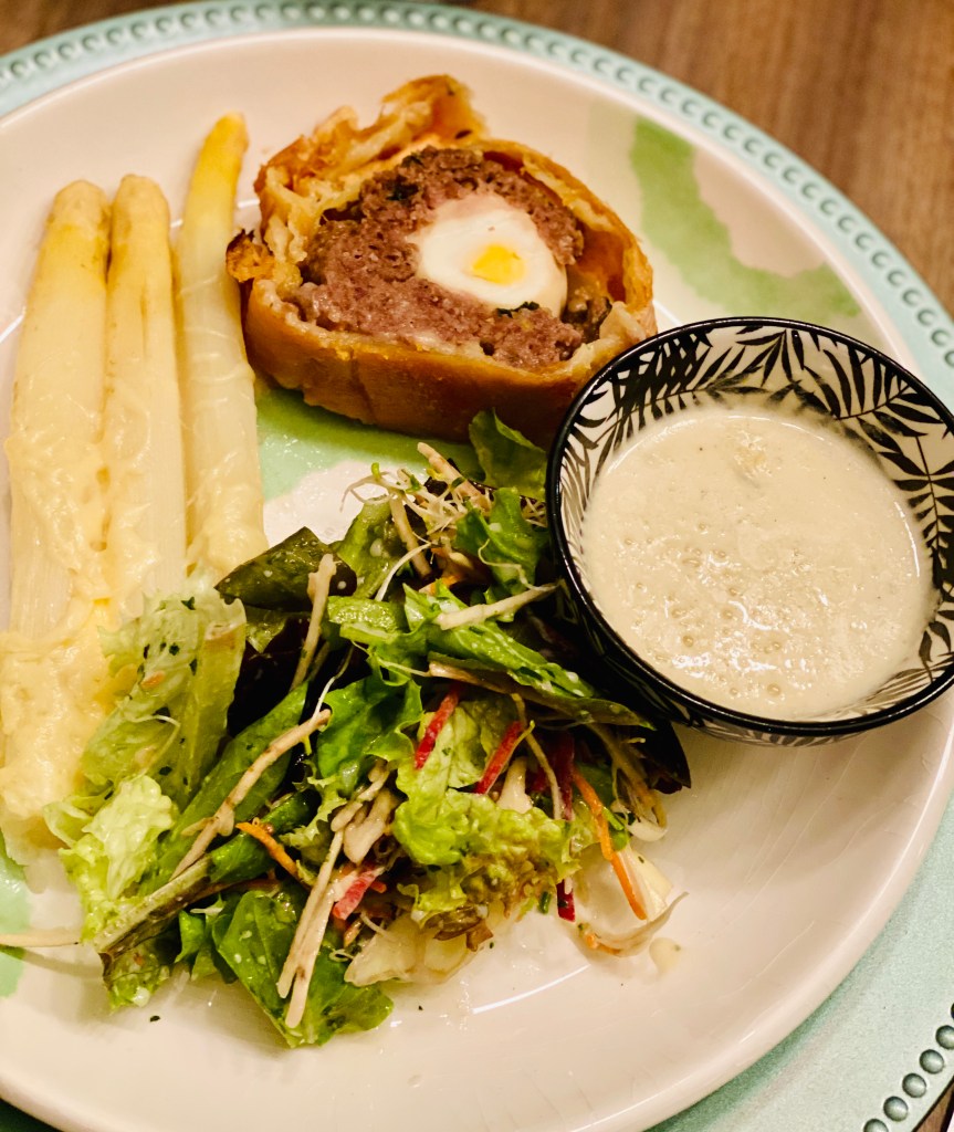 Servir avec lâaccompagnement de votre choix. Ici, salade, asperges blanches et sauce fromage đ€€