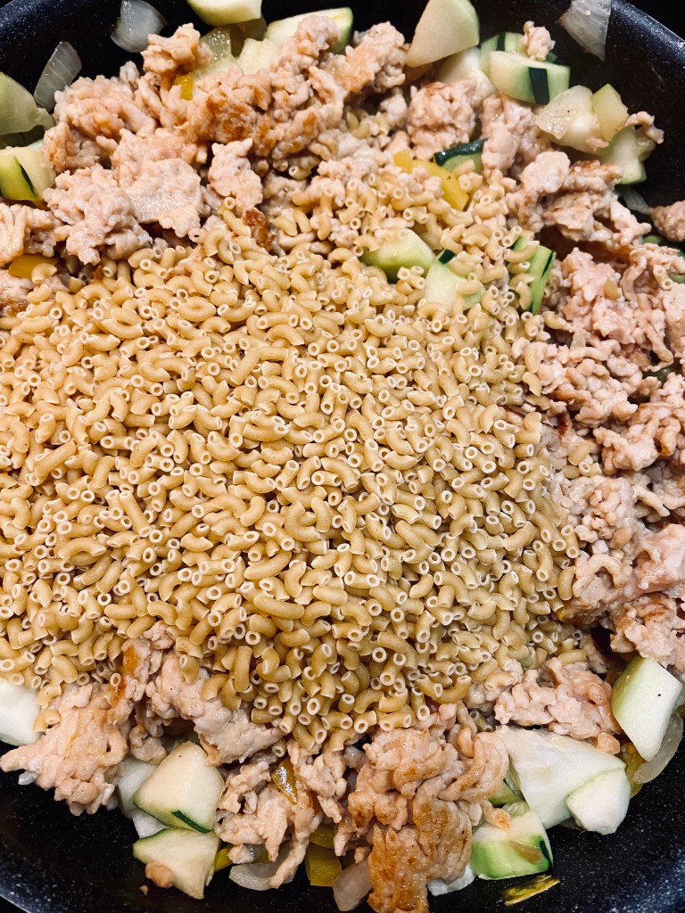 Faire revenir un oignon dans de l’huile d’olive, ajouter du haché de volaille (500g pour 4) Faire revenir juste pour dorer. Ajouter un poivron en dés et une courgette en morceaux. Mélanger et ajouter les coquillettes. Ensuite, recouvrir le mélange avec 2/3 d’eau, un cube de légumes et 1/3 de crème allégée. Saler, poivrer, mélanger et cuire à feu doux avec le couvercle jusqu’à la cuisson des pâtes. 8/10 minutes.