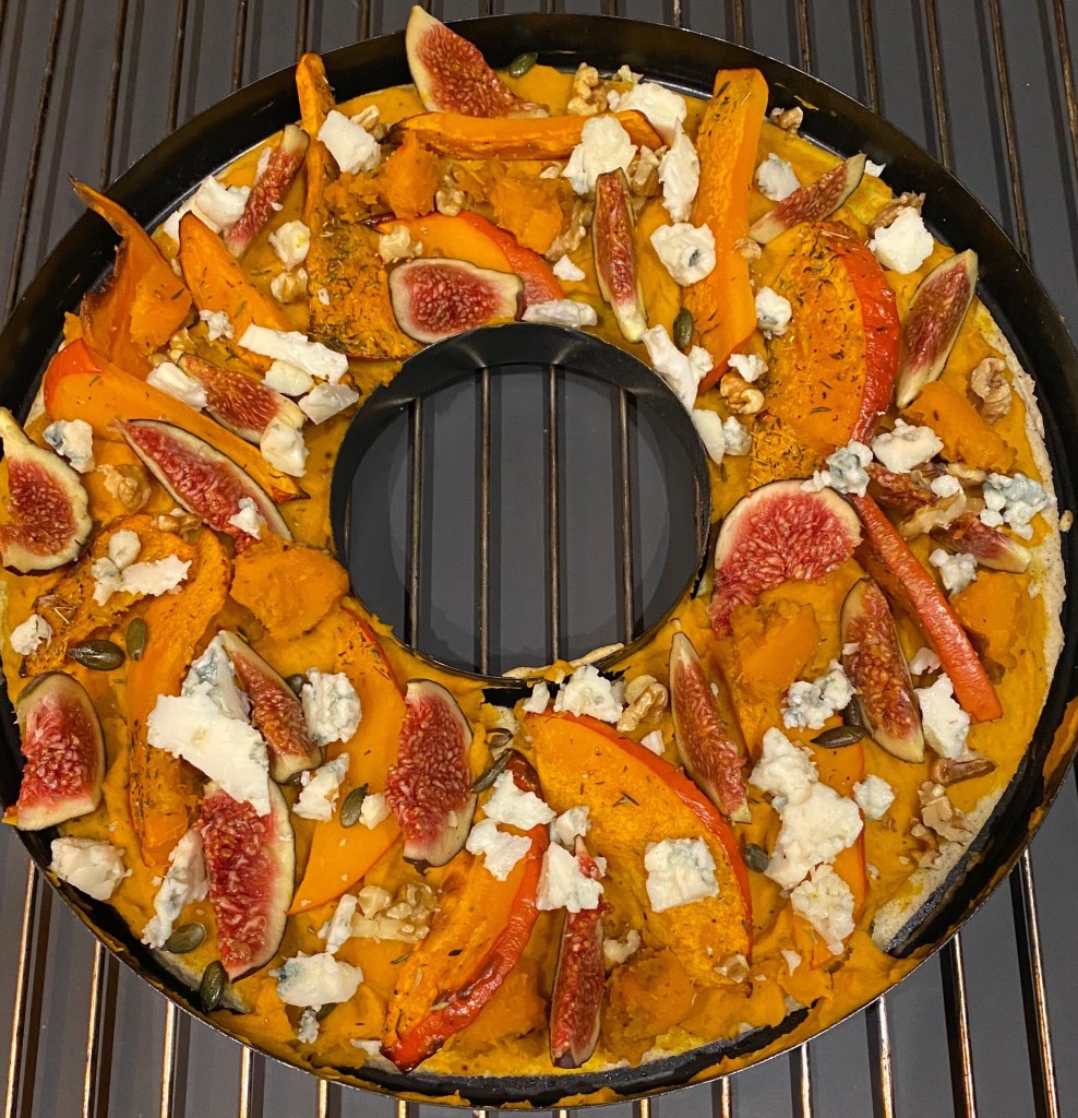 Sur la pâte précuite, étaler la purée. Ajoutez les tranches de potimarrons, les figues coupées en tranches, le roquefort, les noix et les graines de courges. Passez au four 30 minutes à 180C*.