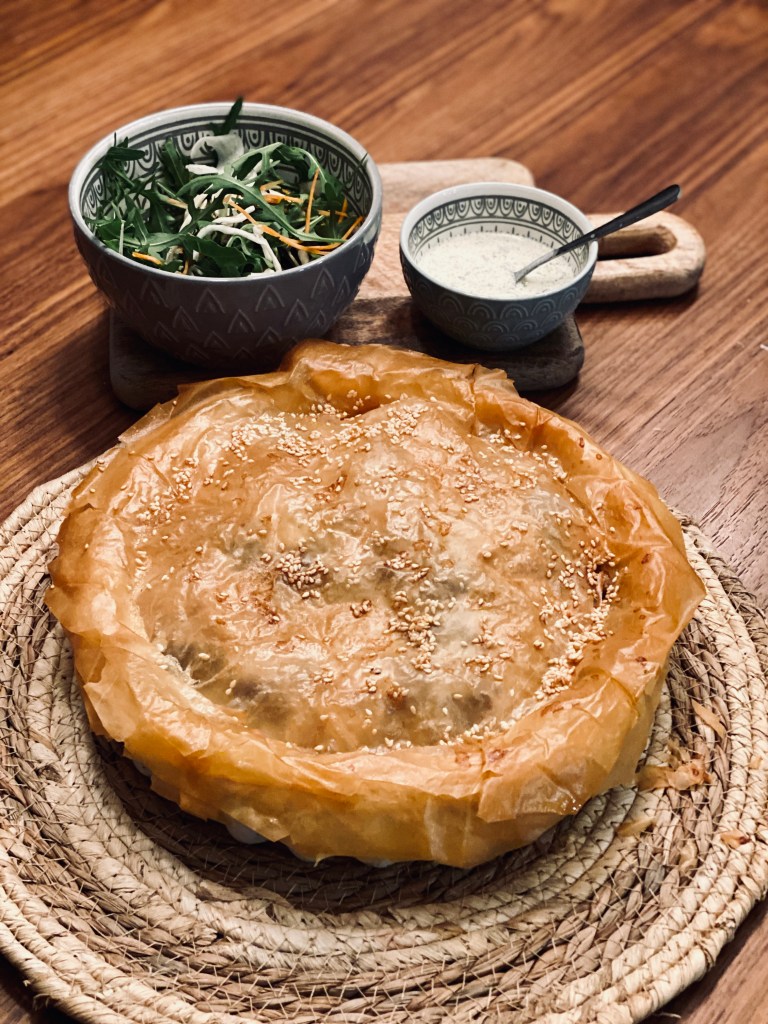 Tourte poulet avec pâte filo. C’est bon et c’est croustillant 😋