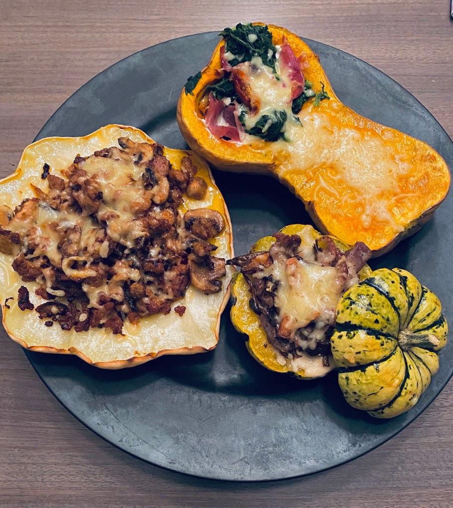 La courge butternut, on enlève les graines et les filaments. Le grand côté avec la chair nous fera une bonne purée 😋 Pareil que le pâtisson pour la cuisson. Pour la farce. Couper en petits morceaux la pancetta, ajouter des épinards, du fromage de chèvre et des tomates séchées. Sel, poivre et du fromage râpé.