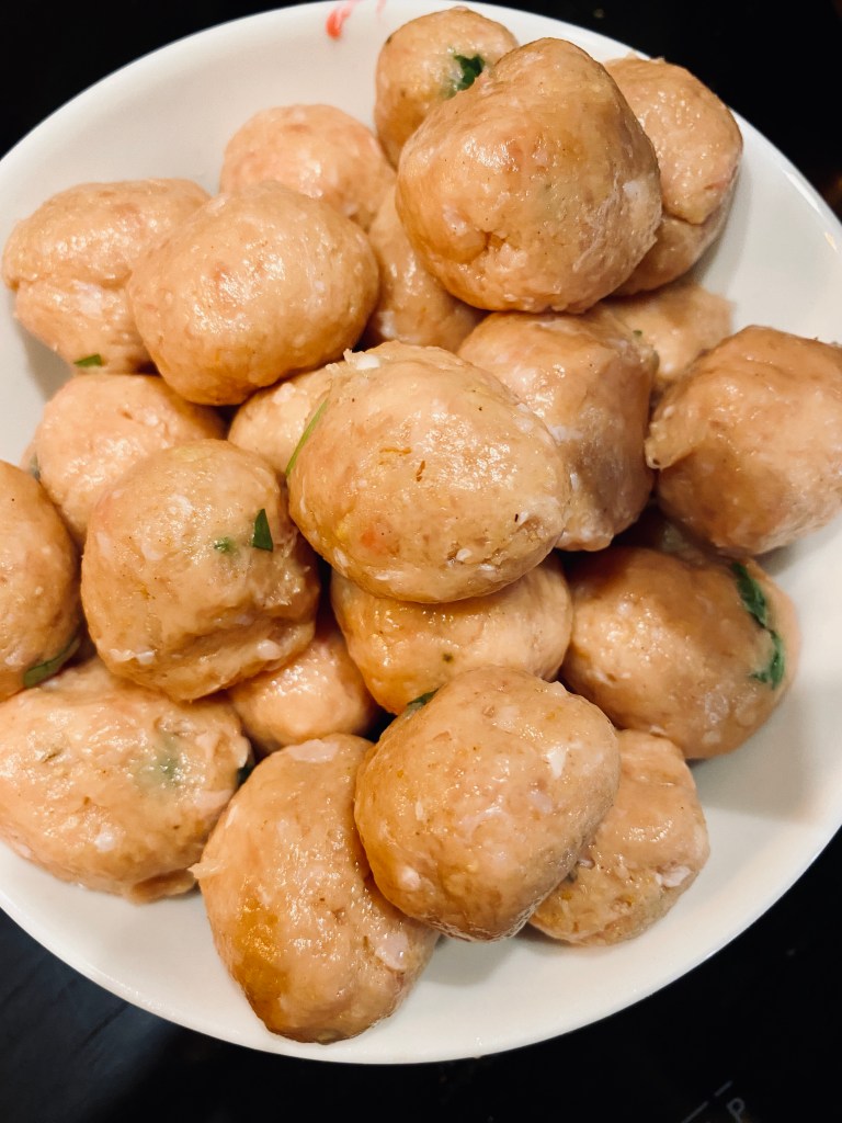 Mettre le haché de poulet dans un plat avec de la chapelure et du persil. Faire des petites boulettes et les ajouter au bouillon.