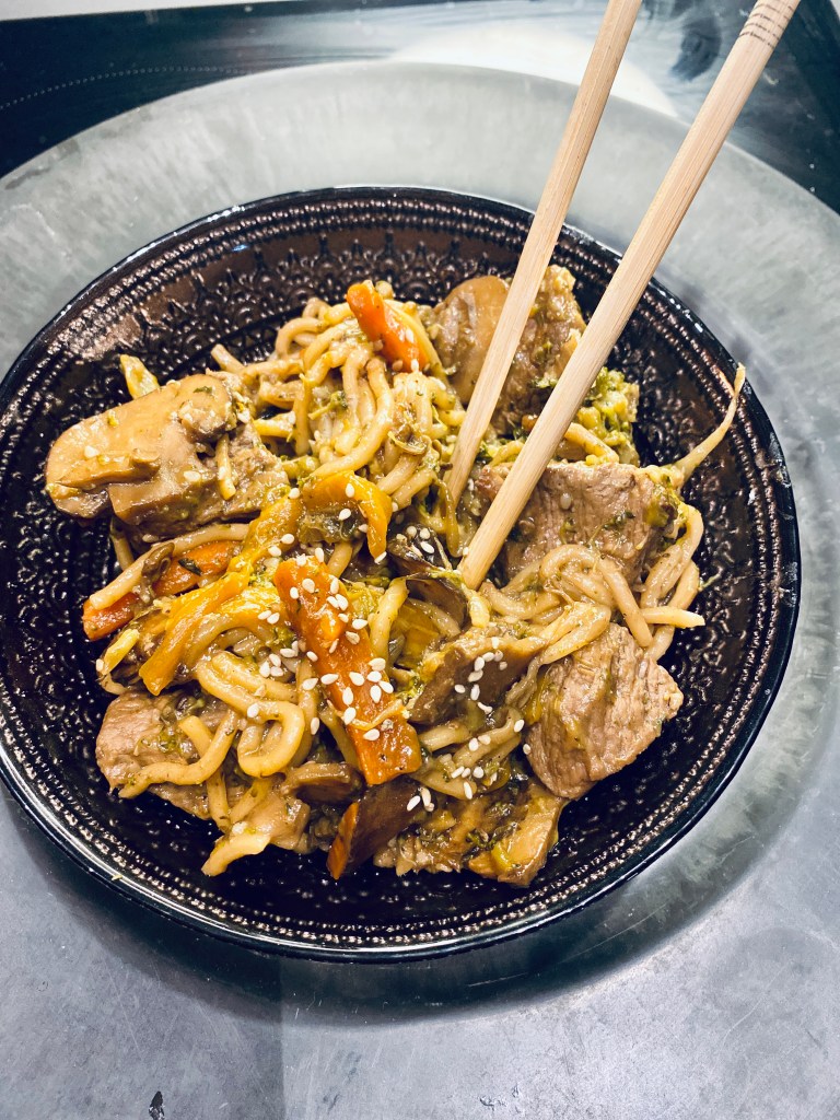 Ajouter ensuite les nouilles cuites selon l’emballage et bien mélanger. Ajouter une cuillère de sauce soja ou deux selon vos préférences, une cuillère de sauce chinoise, de la coriandre, des graines de sésames, du sel et du poivre. Goûter et rectifiez l’assaisonnement. Ajouter une bonne cuillère de beurre de cacahouète et Laisser mijoter si besoin pour avoir la consistance et la cuisson désirée.